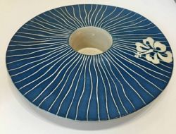 The development of ‘Blueware’ is an ongoing exciting progression of her work, a mix of glaze and burnished blue slip: the sgraffito intricately dripped with a transparent glaze.