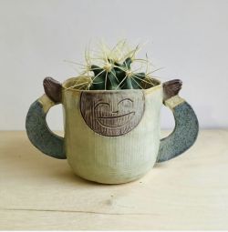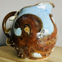 Her work is mostly hand coiled or slump moulded, with some of the larger pieces such as the jugs and tea pots free hand coiled. This gives her work a tactile quality and uniqueness.